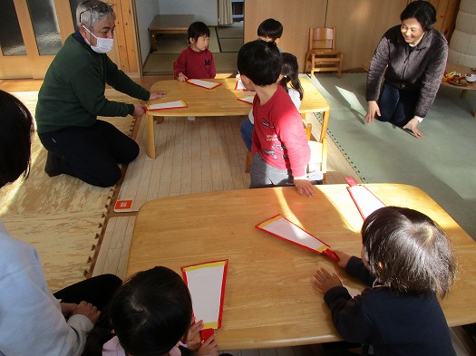 新年に関連のある「お飾り」「門松」…。一緒に言ってみましたが、なかなか難しかったです。でも、うまく言えなくてもかわいい声が聞けました。