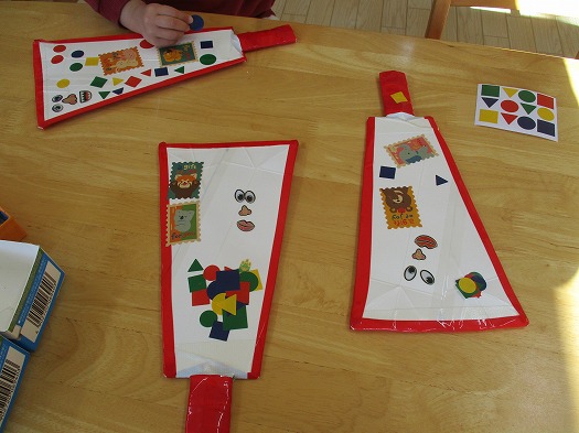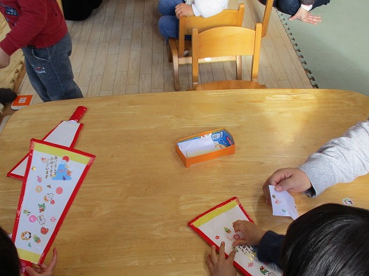 この表・裏には意図があって、表にはお正月に関連のあるシール。裏には目や口などのシールと、区別して貼ってほしいなとの思いがありました。ちゃんと課題をクリアーしていました。いろいろなタイプのシールがあったので、ちょっと疲れたようでした。