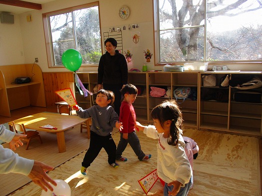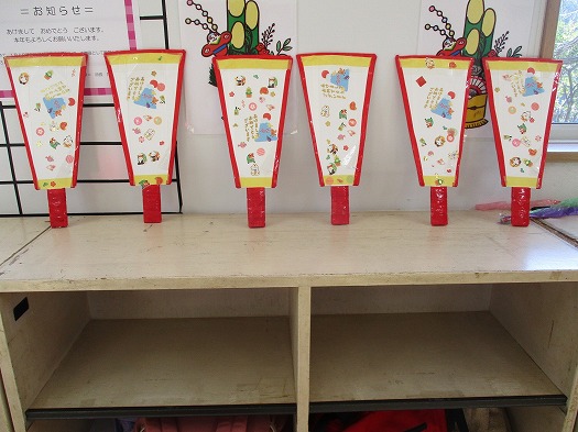 できた羽子板で風船羽根つきをしました。1月は引続き羽根つきをします。