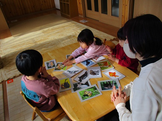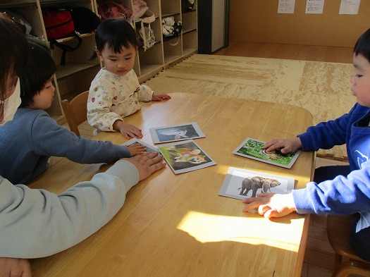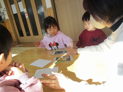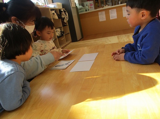 2026年01月23日 1月23日(金)すくすくクラブ ブログ 本日は「おもしろ生き物カルタ」をしました。 まずは、「おちたおちた」-「なにがおちた」のやり取りから、指定された生き物にタッチします。 5枚のカードから始まり、3枚ずつ増えて最後には15枚に! 次は「神経衰弱」。2組(4枚)のカードで行いました。 写真が合ったらうれしそうでした。 風船つき。回を重ねる毎に上手になりました。 帰りの集まりも楽しく行えるようになりました。 また、来週。元気に来てね。 一覧へ戻る